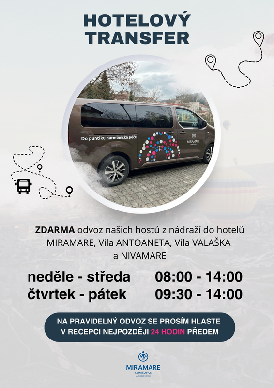 Plánujete pobyt v našem hotelu a přemýšlíte, jak se k nám co nejpohodlněji dostat? Pokud cestujete veřejnou dopravou, máme pro Vás skvělou zprávu! Nabízíme hotelový transfer, který Vás pohodlně a bez starostí dopraví přímo do některého z našich hotelů MIRAMARE, VILA ANTOANETA NEBO NIVAMARE a po skončení pobytu Vás opět odvezeme na nádraží v Luhačovicích.